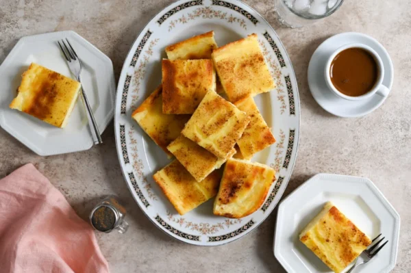 It’s a creamy and indulgent dessert made with layers of phyllo pastry and a custard-like filling made from milk, eggs, sugar, and sometimes semolina or flour for thickening. The filling is typically flavoured with vanilla or lemon zest. Once baked, the pie is often dusted with powdered sugar or cinnamon.