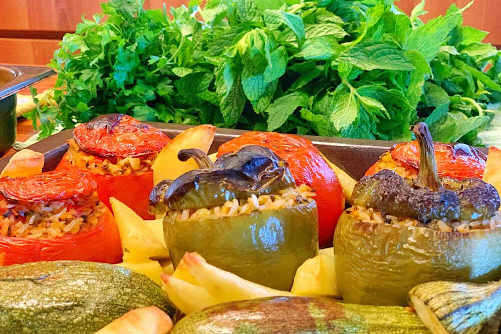 Gemista: A classic Greek dish, ripe tomatoes and bell peppers stuffed with rice, minced meat, and flavorful ingredients, baked to perfection.