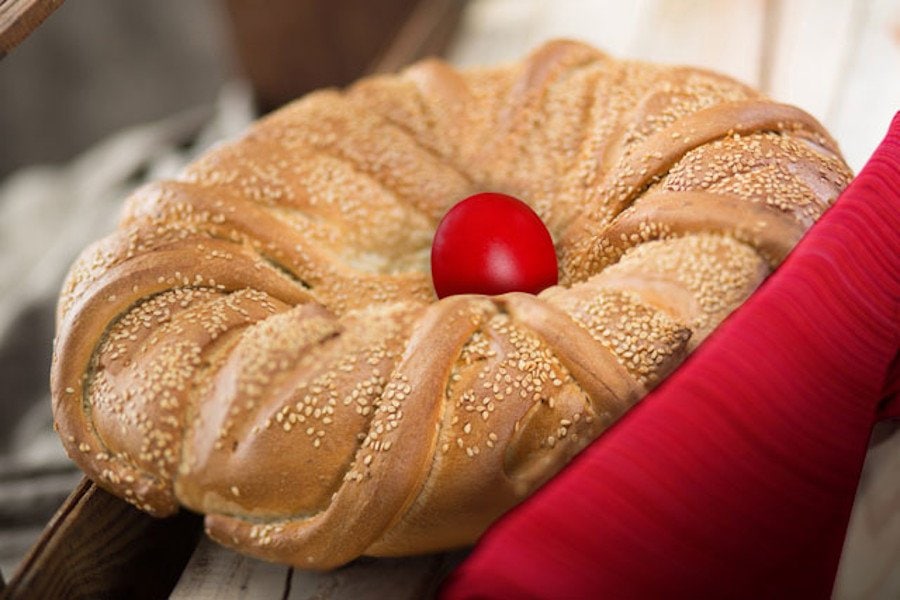 Lambropsomo and lambrokouloura are traditional Easter breads adorned with red-dyed eggs, made with unique aromatic essences, and baked on Good Thursday or Good Saturday night.