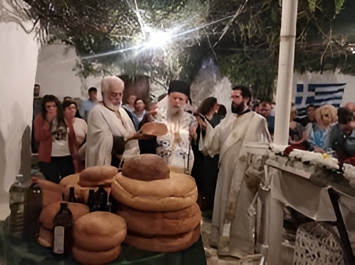 On the evening of the eve, the bells of the Church of Saints Anargyroi ring, calling the faithful to the Festive Vespers. The service includes the Blessing of the Loaves (Artoklasia), a symbol of gratitude and blessings for the community. Often, the Metropolitan of Paronaxia presides over the service, accompanied by local priests, lending a sense of solemnity and importance to the occasion. As dusk falls over the village, the scent of incense and the sound of hymns create an atmosphere of profound spirituality.