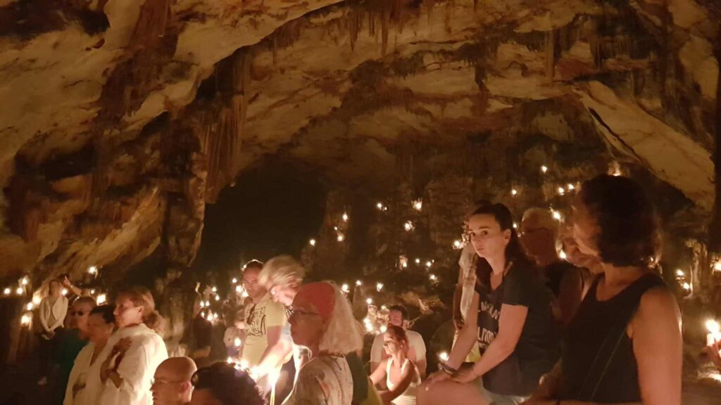On the day of the religious service, dozens of kids climb to the stalagmites to place hundreds of wax candles, creating a spectacular light that highlights the unique colors of the rocks. At the time of the service, the priest and the faithful gather around a small sanctuary and sing the psalms that praise the Saint. In the evening, a festival with musical instruments coming from the surrounding islands takes place in Chora, where the participants celebrate until the morning hours.