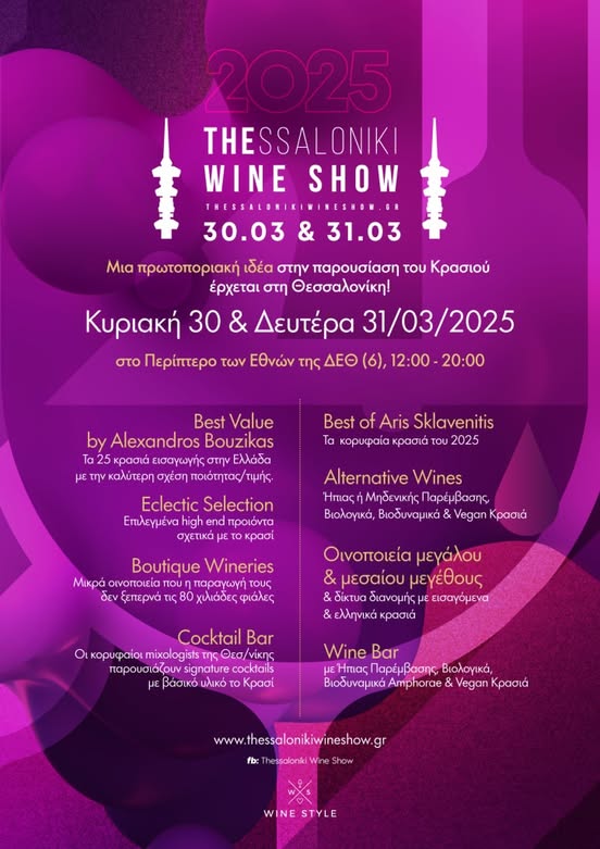 The THESSALONIKI WINE SHOW, the leading wine exhibition of the spring season, returns for the sixth time! On Sunday, March 29, and Monday, March 30, at Pavilion 6 of the Thessaloniki International Fair (TIF), from 12:00 PM to 8:00 PM, wine lovers and professionals will have the opportunity to explore the latest trends in winemaking.