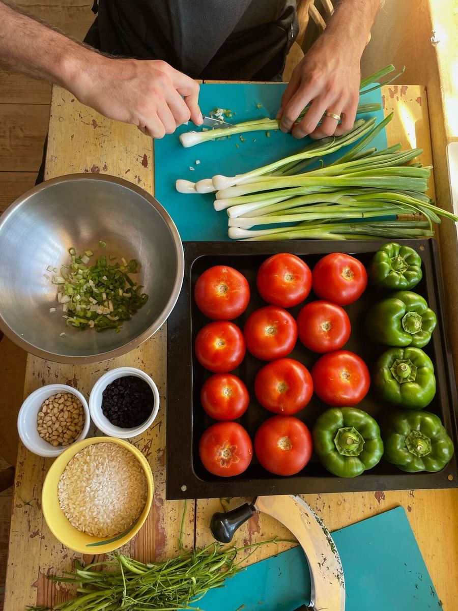 - Stuffed tomatoes and peppers with bulgur, pine nuts, and currants