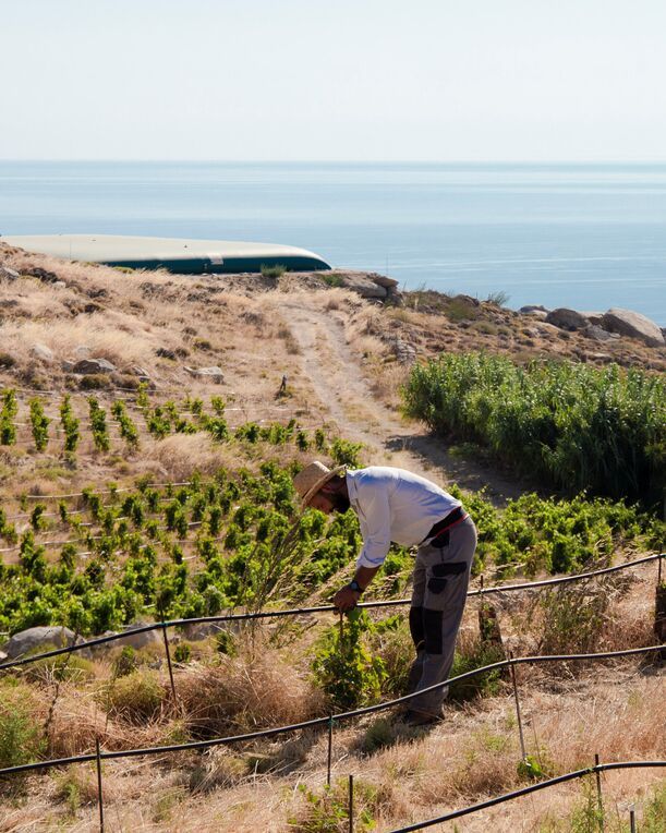 Your experience begins with a guided walk through our first organic vineyard in Messarea, a 5-acre estate planted in 2021 on sandy, schistose soils. This is the land that first inspired our family to revive the island’s ancient viticultural heritage — hidden vineyard plots rediscovered within the estate’s age-old terraces and olive groves.