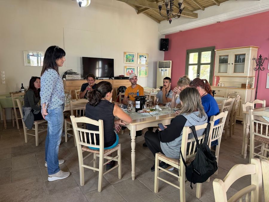 At Ariousios Winery, the only visitable winery on Chios, guests enjoy a guided tour of the underground cellar, where wines mature in French oak barrels. Special attention is given to the flagship wine “Austiros”, aged with precision and care.